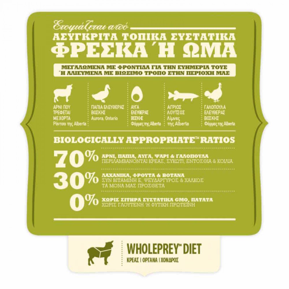 Πλήρης Ολιστική Τροφή, Χωρίς Σιτηρά, από Αρνί, Πάπια, Αυγά, Ρέγγα και Γαλοπούλα, κατάλληλη για Σκυλάκια Όλων των Φυλών και των Σταδίων Ζωής (All Life Stages). Πρόκειται για βραβευμένη, βιολογικά κατάλληλη συνταγή, μαγειρεμένη σε παγκοσμίου κλάσης κουζίνες του Καναδά.