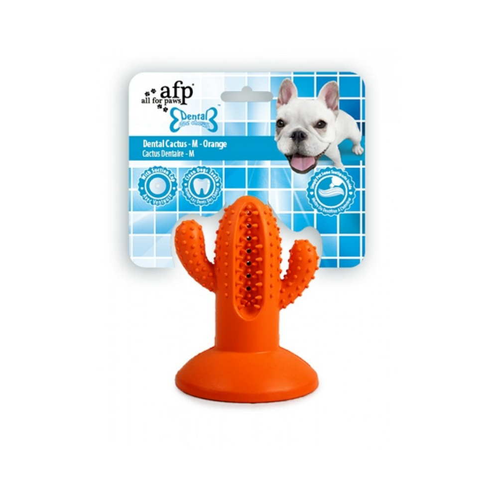 Οδοντικό παιχνίδι απασχόλησης σε σχήμα κάκτου, με εσωτερικό κανάλι για τοποθέτηση της οδοντόκρεμας και ειδικά διαμορφωμένες σφαιρικές εξοχές και ακίδες για καθαρισμό και μασάζ δοντιών και ούλων, κατάλληλο για σκυλάκια φυλών μεσαίου μεγέθους. Το Dental Cactus από την All For Paws κατασκευάζεται από υψηλής ποιότητας καουτσούκ που προσκαλεί το σκυλάκι σας να απολαύσει ώρες μασήματος και ενασχόλησης, ενώ ταυτόχρονα φροντίζει για την οδοντική υγεία του.