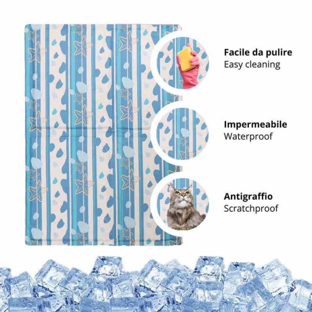Δροσιστικό χαλάκι για τις ζεστές μέρες του καλοκαιριού, κατάλληλο για σκυλάκια, γατούλες και τρωκτικά. Το χαλάκι Fresh Sea Dream από την Croci κατασκευάζεται από πολυεστέρα και PVC, ανθεκτικό στις γρατζουνιές και αδιάβροχο, ιδανικό για ζωάκια με προβλήματα ακράτειας. Εσωτερικά περιέχει στρώση τζελ, 100% ασφαλής για ζώα και ανθρώπους, η οποία δρα σαν ρυθμιστής της θερμοκρασίας του σώματος του αγαπημένου σας τετράποδου. Μέσω της έμμεσης επαφής ανάμεσα στο σώμα του ζώου και της στρώσης τζελ απάγεται θερμότητα από το σώμα του ζώου, δροσίζοντας και ανακουφίζοντάς το από την υπερβολική ζέστη γύρω του. Η όλη διαδικασία γίνεται σταδιακά χωρίς πρόσθετα βοηθήματα όπως ηλεκτρικό ρεύμα ή νερό. Το χαλάκι καθαρίζεται εύκολα με υγρό πανί, ενώ δεν συγκρατεί τρίχες και ακαθαρσίες. Είναι αναδιπλούμενο για εύκολη μεταφορά και αποθήκευση και προσφέρει άνεση, ειδικά πάνω σε σκληρές επιφάνειες χάρις στην ελαφρώς αφράτη του γέμιση. Μπορεί να χρησιμοποιηθεί έξω και μέσα στο σπίτι, στο αυτοκίνητο και τη βόλτα. Μια ασφαλής και αποτελεσματική λύση που ο μικρός μας φίλος είναι σίγουρο ότι θα λατρέψει !!!