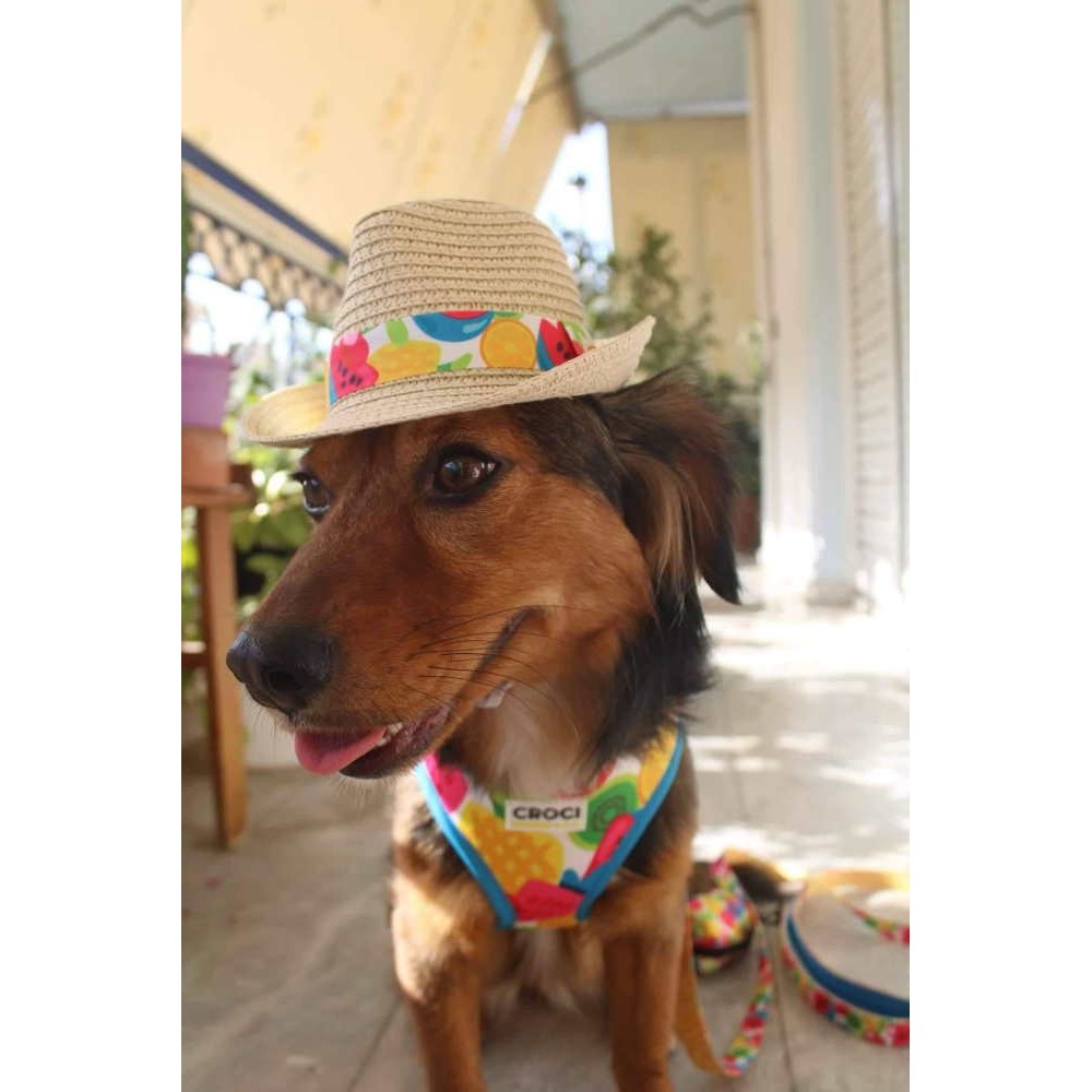 Ψάθινο καπελάκι, διακοσμημένο με όμορφη κορδελίτσα με φρουτάκια, κατάλληλο για σκυλάκια, γατούλες και τρωκτικά. Ένα ιδιαίτερο, καλοκαιρινό αξεσουάρ για το ζωάκι σας για διασκεδαστικές φωτογραφίες με γούστο και μοδάτες βόλτες με τον μικρό μας φίλο. Το καπελάκι περιέχει ρυθμιζόμενο κορδόνι περίσφιξης για τέλεια εφαρμογή και μέγιστη άνεση. Απλώς φορέστε το και η διασκέδαση αρχίζει !!!