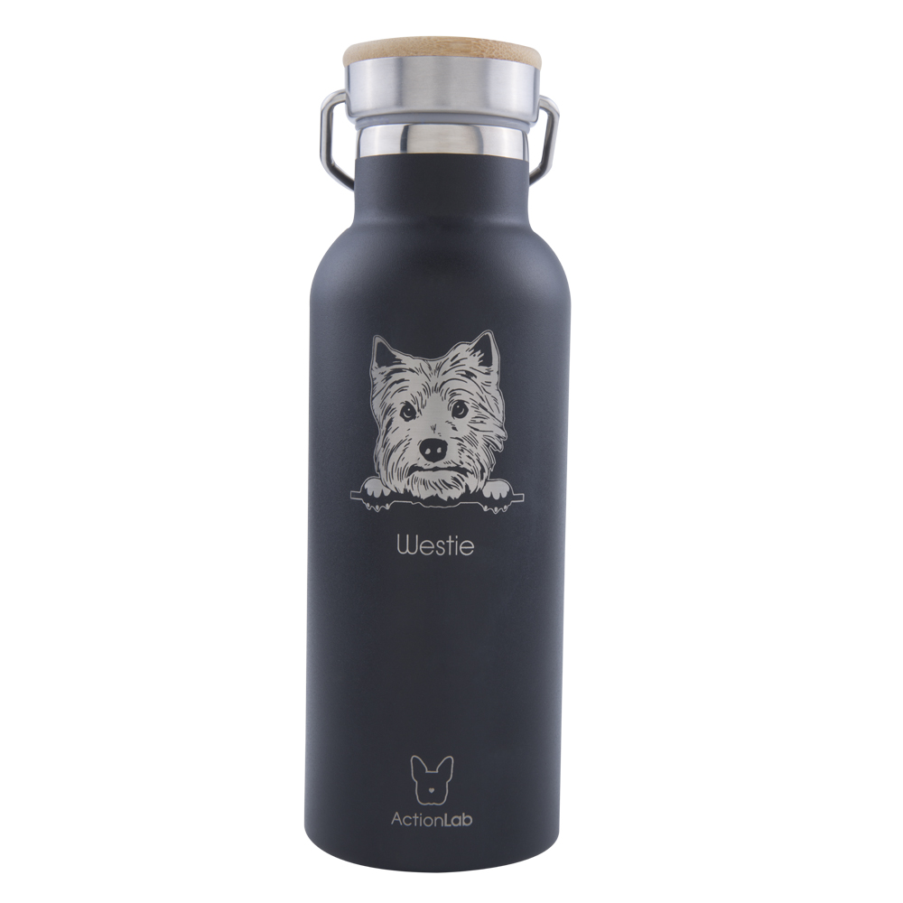 Eco Life Bamboo Thermos Μαύρο Westie 370ml, ένα κομψό και πρακτικό θερμός με χαριτωμένο σχέδιο σκύλου Westie, ιδανικό για φιλόζωους που αγαπούν το στυλ και την οικολογική συνείδηση. Με καπάκι από φυσικό bamboo και ανθεκτική κατασκευή από ανοξείδωτο ατσάλι 18/8, προσφέρει υψηλή απόδοση και ασφάλεια.
