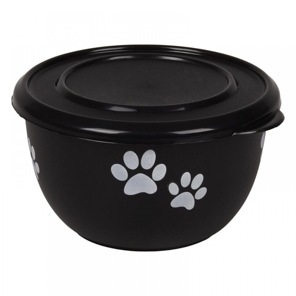 Mπoλ με καπάκι για σκυλάκι ή γατούλα χωρητικότητας 600ml και διαμέτρου 12,7cm, από ανοξείδωτο ατσάλι σε χρώμα μαύρο με λευκά πατουσάκια, από την Flamingo. Κατάλληλο για νερό, φαγητό και αποθήκευση barf. Ιδανικό για ταξίδια, μεγάλες βόλτες και εν κινήσει για να έχετε πάντα μαζί σας και με ασφαλές τρόπο το φαγητό του μικρού σας φίλου. To καθάρισμα του είναι ιδιαίτερα εύκολο.
