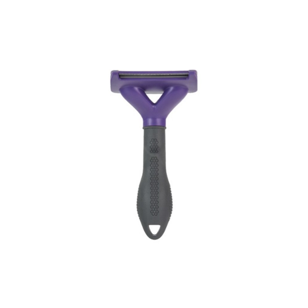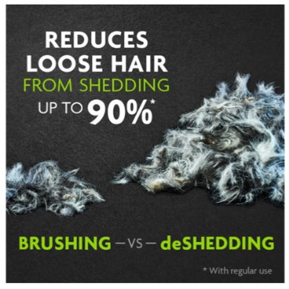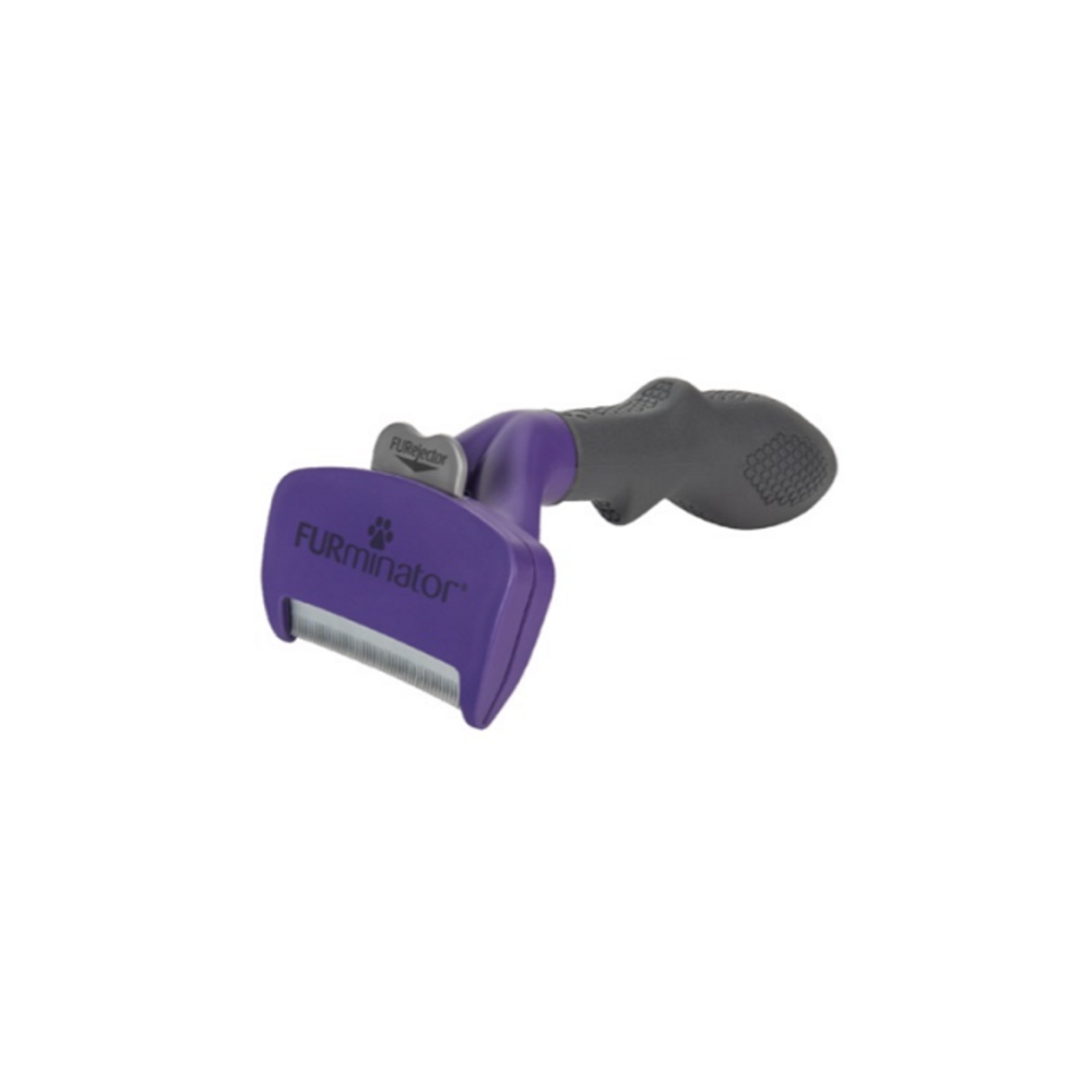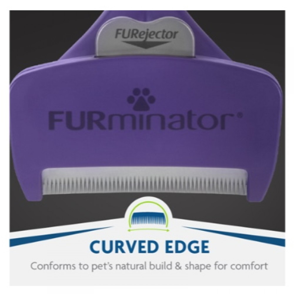 Εργαλείο deShedding από την Furminator για τον καλλωπισμό του τριχώματος και την απομάκρυνση της νεκρής τρίχας, κατάλληλο για κοντότριχες γατούλες, μεσαίου και μεγάλου μεγέθους (4,5Kg και άνω). Πρόκειται για ένα ποιοτικό εργαλείο καλλωπισμού, σχεδιασμένο από επαγγελματίες groomers, που διεισδύει και απομακρύνει με μεγάλη αποτελεσματικότητα και ασφάλεια το νεκρό τρίχωμα, τόσο από την επιφάνεια όσο και από το υπόστρωμα, χωρίς να κόβει την τρίχα ή να δημιουργεί βλάβη σε επιφανειακό τρίχωμα και δέρμα. Με το deShedding Tool της Furminator το μάδημα του ζώου μειώνεται έως και 90%. Τα δοντάκια είναι κατασκευασμένα από ανοξείδωτο ατσάλι με τεχνολογία Edge Guard που τα προστατεύει κατά την αποθήκευση, ενώ η διάταξή τους σε σχήμα καμπύλης, ακολουθεί πιστά το καλούπι του ζώου για μεγαλύτερη ευκολία και άνεση στο βούρτσισμα. Το φινίρισμα Skin Guard αριστερά και δεξιά από τη σειρά των δοντιών βοηθά το εργαλείο να γλιστρά πάνω στο δέρμα και να μην μπλοκάρει από συσσώρευση τριχών, ενώ η εργονομική αντιολισθητική λαβή του προσφέρει μέγιστο έλεγχο και άνεση κατά τη χρήση. Το εργαλείο διαθέτει ειδικό κουμπί FURejector που απελευθερώνει τις συσσωρευμένες τρίχες με ευκολία και χωρίς κόπο.