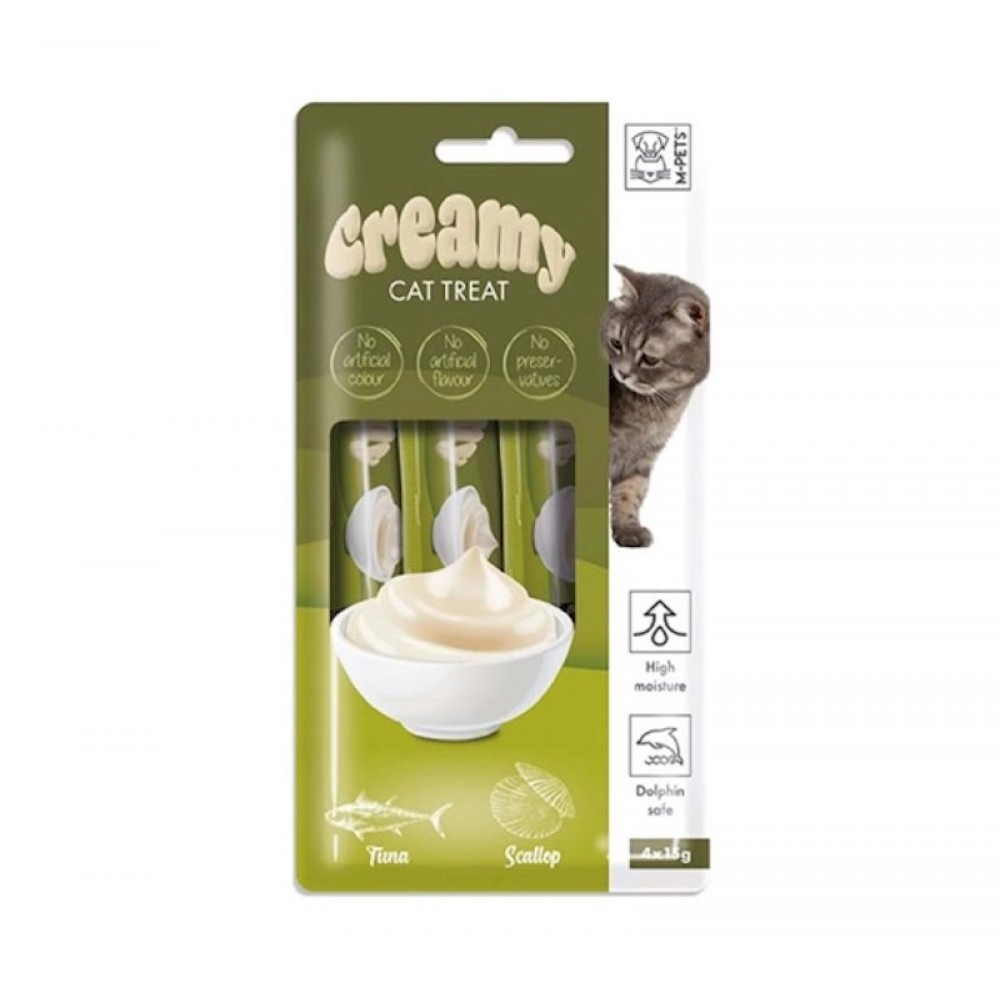 Γευστική λιχουδιά σε μορφή κρέμας με γεύση τόνο και χτένια. Κατάλληλο για ανήλικες, ενήλικες και ηλικιωμένες γατούλες. Αποτελείται από φυσικά συστατικά και δεν περιέχει σιτηρά, συντηρητικά ή τεχνητά χρώματα. Έχει υψηλή περιεκτικότητα σε υγρασία μιας και τη χρειάζονται οι γατούλες και χαμηλή περιεκτικότητα σε λιπαρά. Μπορείτε να την προσφέρετε ως λιχουδιά, ως συμπλήρωμα στην καθημερινή της διατροφή ή ακομα μπορείτε να την προσθεσετε στην ξηρά τροφή της, για επιπλέον υγρασία και γεύση. Αποτελεί ιδανική επιλογή για τα γατάκια που δυσκολεύονται να καταπιούν χάπι, καθώς μπορείται να το ανακατέψετε με την κρεμούλα. Η συσκευασία περιέχει 4 σωληνάρια, τα οποία μετά το άνοιγμα διατηρούνται στο ψυγείο.