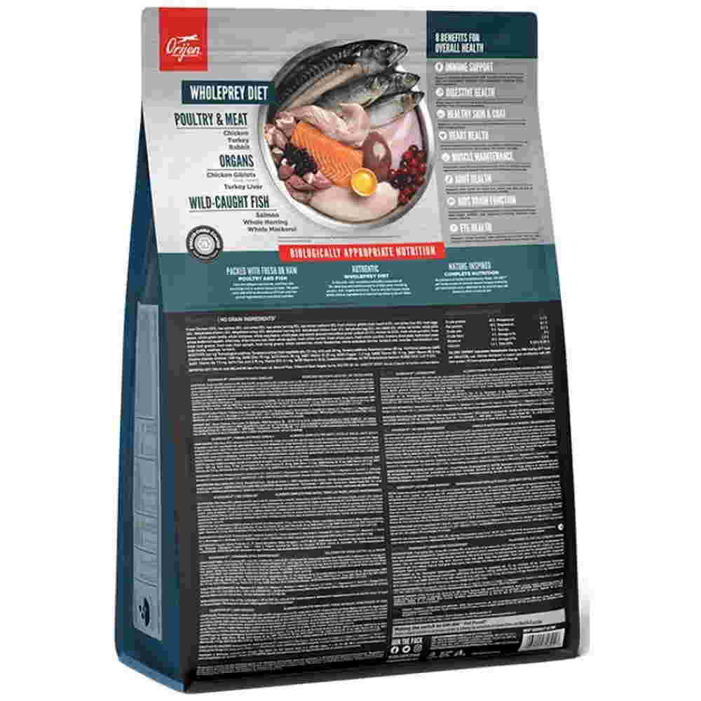 Στη φύση οι πρόγονοι τόσο του σκύλου όσο και της γάτας κατανάλωναν τα πιο χυμώδη και θρεπτικά κομμάτια του θηράματος, συμπεριλαμβανομένων και οργάνων όπως η καρδιά, το συκώτι και τα νεφρά, καθώς και μικρές ποσότητες από κόκαλα. Η μεγάλη διατροφική αξία αυτών των υπερτροφών έγκειται στο γεγονός ότι είναι γεμάτα από θρεπτικά συστατικά όπως αμινοξέα, λιπαρά οξέα και ιχνοστοιχεία. Με τις WholePrey αναλογίες στα ζωικά της συστατικά, η Orijen πετυχαίνει να συμπεριλαμβάνει στις συνταγές της τη θρεπτική αξία αυτών των υπερτροφών, κατευθείαν από τις πρώτες ύλες, χωρίς να χρειάζεται να τις εμπλουτίζει έπειτα με υπερβολικά πολλά συνθετικά πρόσθετα. Τις ζωικές αυτές πρώτες ύλες έρχονται να συμπληρώσουν διατροφικά προσθήκες λαχανικών, φρούτων, βοτάνων, βιταμινών, μετάλλων και προβιοτικών, ενώ γίνεται χρήση συντηρητικών αυστηρά και μόνο φυσικής προέλευσης.