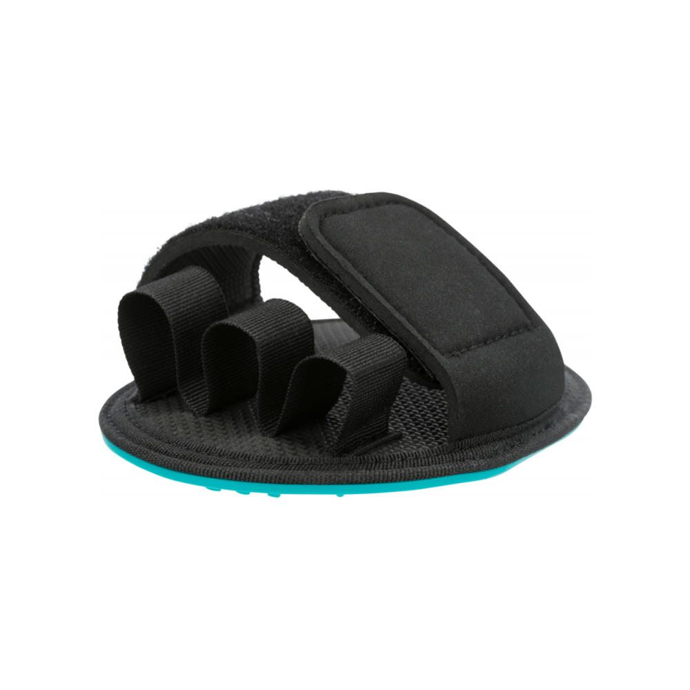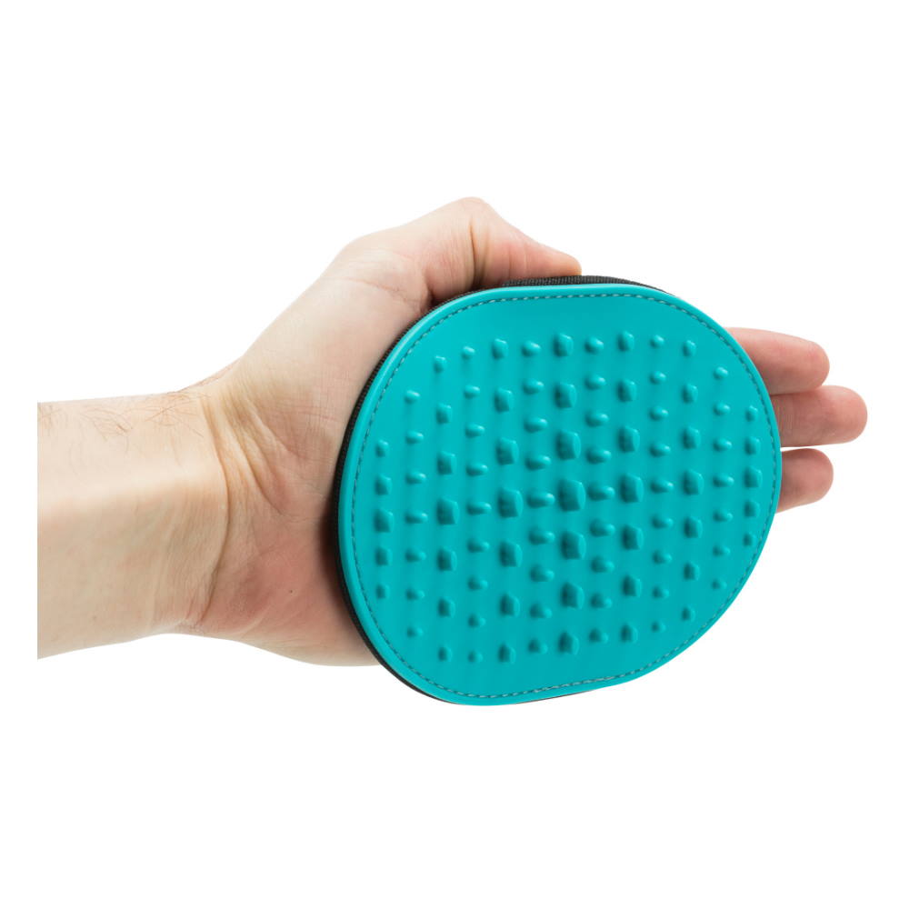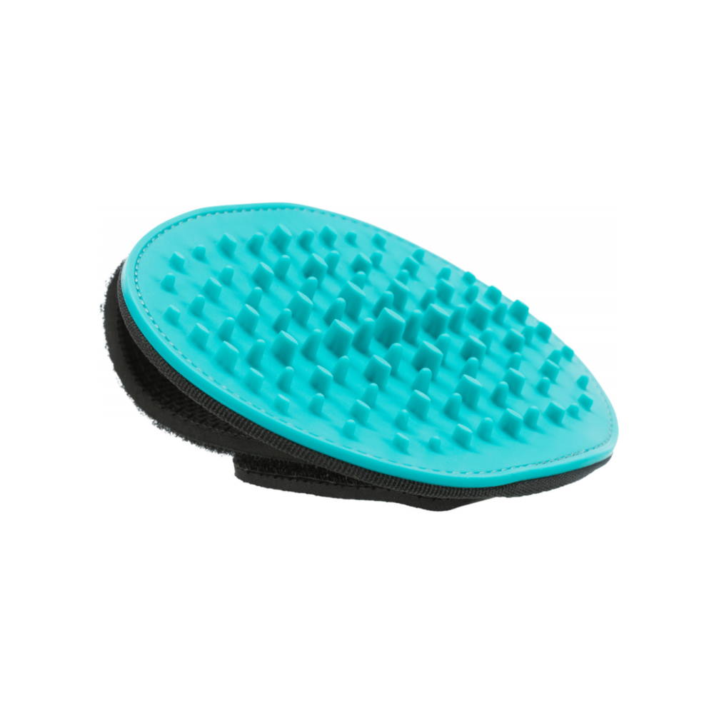 Βούρτσα σε μορφή γαντιού με αραιή διάταξη από δοντάκια σιλικόνης, για μασάζ και λείανση του τριχώματος επιφάνειας, καθώς και για απομάκρυνση νεκρού τριχώματος. Κατάλληλη για σκυλάκια και γατούλες με δερματικές ευαισθησίες ή που δυσκολεύονται να εξοικειωθούν με την διαδικασία του βουρτσίσματος. Με την Massage Brush της Trixie μπορείτε να περιποιηθείτε το τρίχωμα και να απομακρύνετε νεκρές τρίχες ανώδυνα, με γρήγορο και εύκολο τρόπο, ενώ παράλληλα προσφέρετε στο ζωάκι σας ένα πολύ ευεργετικό μασάζ. Ταυτόχρονα η χρήση του γαντιού βοηθά στην εξοικείωση του ζώου με την διαδικασία του καλλωπισμού, καθώς το αντιλαμβάνεται ως προέκταση του χεριού σας και το βούρτσισμα ως χάδι. Το γάντι διαθέτει θηλιές για τα δάχτυλα και strap για όλη την παλάμη, προσφέροντας σταθερό κράτημα και άνεση στη χρήση.