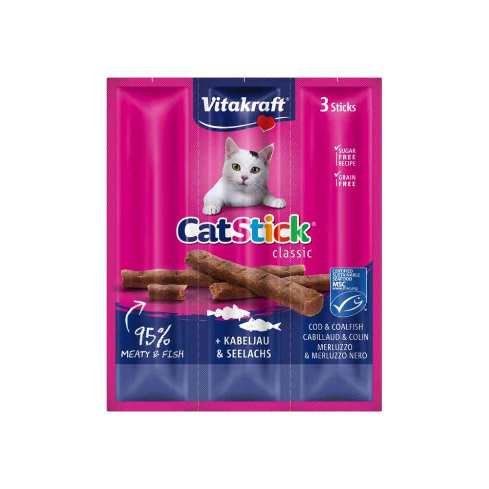 Τα Vitakraft Cat Sticks Classic Cod & Coalfish αποτελούν ένα εξαιρετικά γευστικό σνακ με 95% περιεκτικότητα σε κρέας και σκόπιμα ουδέτερη οσμή, ώστε να μην ενοχλούν την ευαίσθητη μυτούλα της γατούλας σας. Χωρίς ζάχαρη, τεχνητά χρώματα και ενισχυτικά γεύσης, τα sticks είναι σχεδιασμένα ώστε να κόβονται εύκολα σε μικρά κομματάκια και διατίθενται σε συσκευασία των 3 τεμαχίων, με το κάθε stick να συσκευάζεται ατομικά και αεροστεγώς για μεγαλύτερη φρεσκάδα και ευκολία.