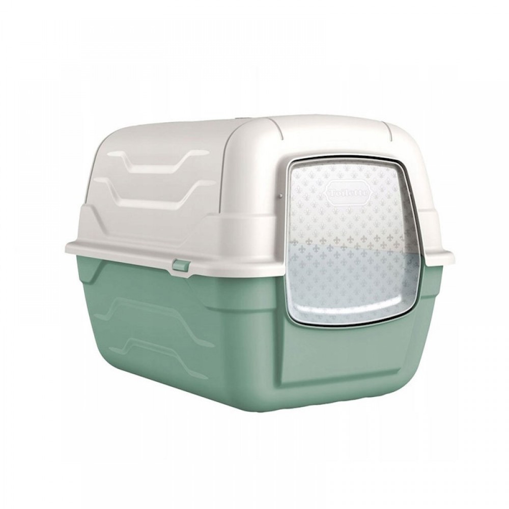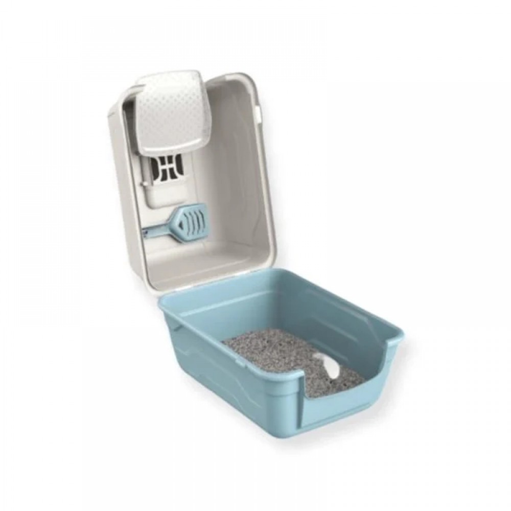 Κλειστή λεκάνη υγιεινής, κατάλληλη για όλες τις γατούλες. Κατασκευασμένη από πλαστικό υψηλής ποιότητας με ημιδιαφανή πόρτα. Διαθέτει φίλτρο τοποθετημένο στο επάνω κάλυμμα που καθαρίζει τον αέρα και αποτρέπει τη διαφυγή δυσάρεστων οσμών έξω από αυτή. Διαθέτει επίσης ένα φτυαράκι στο πάνω μέρος του καπακιού, για την απομάκρυνση των ακαθαρσιών. Χάρη στο σχήμα της, καταλαμβάνει λίγο χώρο και σας επιτρέπει να μεγιστοποιήσετε τον ελεύθερο χώρο στο δωμάτιο (μπάνιο, χωλ κ.λπ.).