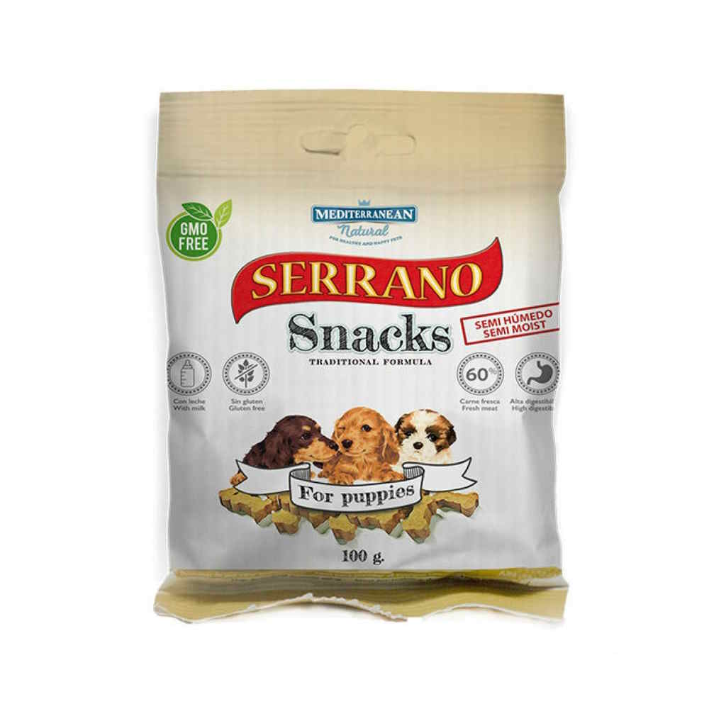 Το Serrano Snacks For Puppies αποτελεί ένα 100% φυσικό σνακ από φρέσκο κρέας σε ποσοστό 60%, πλούσιο σε ολεϊκό οξύ, καθώς και σε έλαιο ρίγανης, προωθώντας την υγεία του πεπτικού συστήματος. Χωρίς γλουτένη, χωρίς τεχνητά χρώματα, χωρίς trans - λιπαρά οξέα, χωρίς GMO και με αεροστεγή συσκευασία, μικρού μεγέθους, για την άριστη