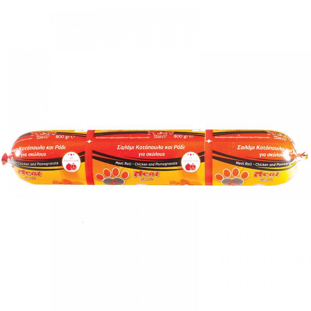 Λαχταριστό Σαλάμι από Κοτόπουλο και Ρόδι. Αποτελείται από 95% κοτόπουλο και 5% ρόδι. Πλούσιο σε βιταμίνη Α, B1, Β2, Β6, C και φολικό οξύ. Ο συνδυασμός κοτόπουλο - ρόδι έχει ισχυρή αντιοξειδωτική δράση που προστατεύει τον οργανισμό. Αποτελεί μια πολύ καλή καλή πηγή φυτικών ινών, ωφέλιμες για την καλή υγεία του εντέρου του σκύλου. Ενδύκνεται και για την πρόληψη των οδοντικών παθήσεων. Παρασκευάζεται από πρώτες ύλες εξαιρετικής ποιότητας, με υψηλή περιεκτικότητα σε κρέας, για να προσφέρει όλα τα απαραίτητα θρεπτικά συστατικά. Αποτελεί την καλύτερη επιλογή για σκυλάκια με αλλεργίες. Δεν περιέχει χρωστικές. Μπορείτε να το δώσετε σαν λιχουδιά για να ευχαριστήσετε το σκύλο σας οποιαδήποτε ώρα της ημέρας ή να το προσθέσετε σε κομμάτια στην τροφή του για μεγαλύτερη γευστική ποικιλία. Όταν ανοιχτεί διατηρείται σε ψυγείο και καταναλώνεται εντός 3-4 ημερών.