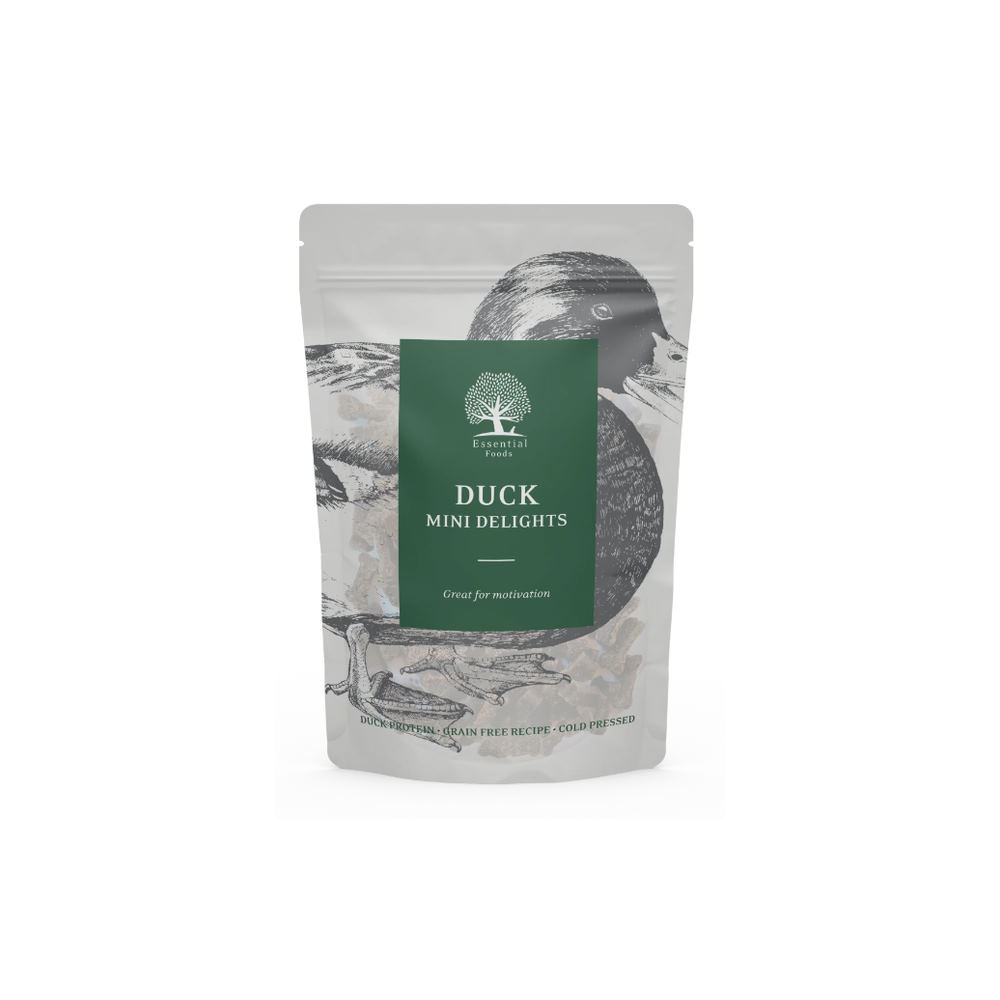 Λαχταριστές Λιχουδιές Μέσης Υγρασίας (Semi – Moist), Χωρίς Σιτηρά, από Πάπια, κατάλληλες για Όλα τα Σκυλάκια. Ένα συμπλήρωμα διατροφής που μπορεί να δοθεί ανά πάσα στιγμή μέσα στη μέρα ως λιχουδιά, ως κίνητρο κατά την εκπαίδευση, ως επιβράβευση, αλλά και σαν ένα απλό σνακ στη διάρκεια της βόλτας. Πλούσιο σε πάπια και μαγειρεμένο σε χαμηλές θερμοκρασίες ώστε να διατηρεί την θρεπτική του αξία αναλλοίωτη, το συμπλήρωμα αυτό όπως και οι τροφές της Essential Foods υπακούει στον κανόνα BOF (Behavioural Optimizing Food), διατηρώντας τα επίπεδα ζαχάρου στο αίμα σταθερά στη διάρκεια της ημέρας, αποτρέποντας τις μεγάλες διακυμάνσεις που έχουν επίδραση τόσο στη φυσική κατάσταση, όσο και στη διάθεση του ζώου. Με μικρό μέγεθος – περίπου 1 cm η λιχουδιά – και συσκευασία επανακλειόμενη, οι Essential Duck Mini Delights θα γίνουν αναπόσπαστο κομμάτι της βόλτας ή του παιχνιδιού, χαρίζοντας στο σκυλάκι σας μπουκιές απόλαυσης !!!