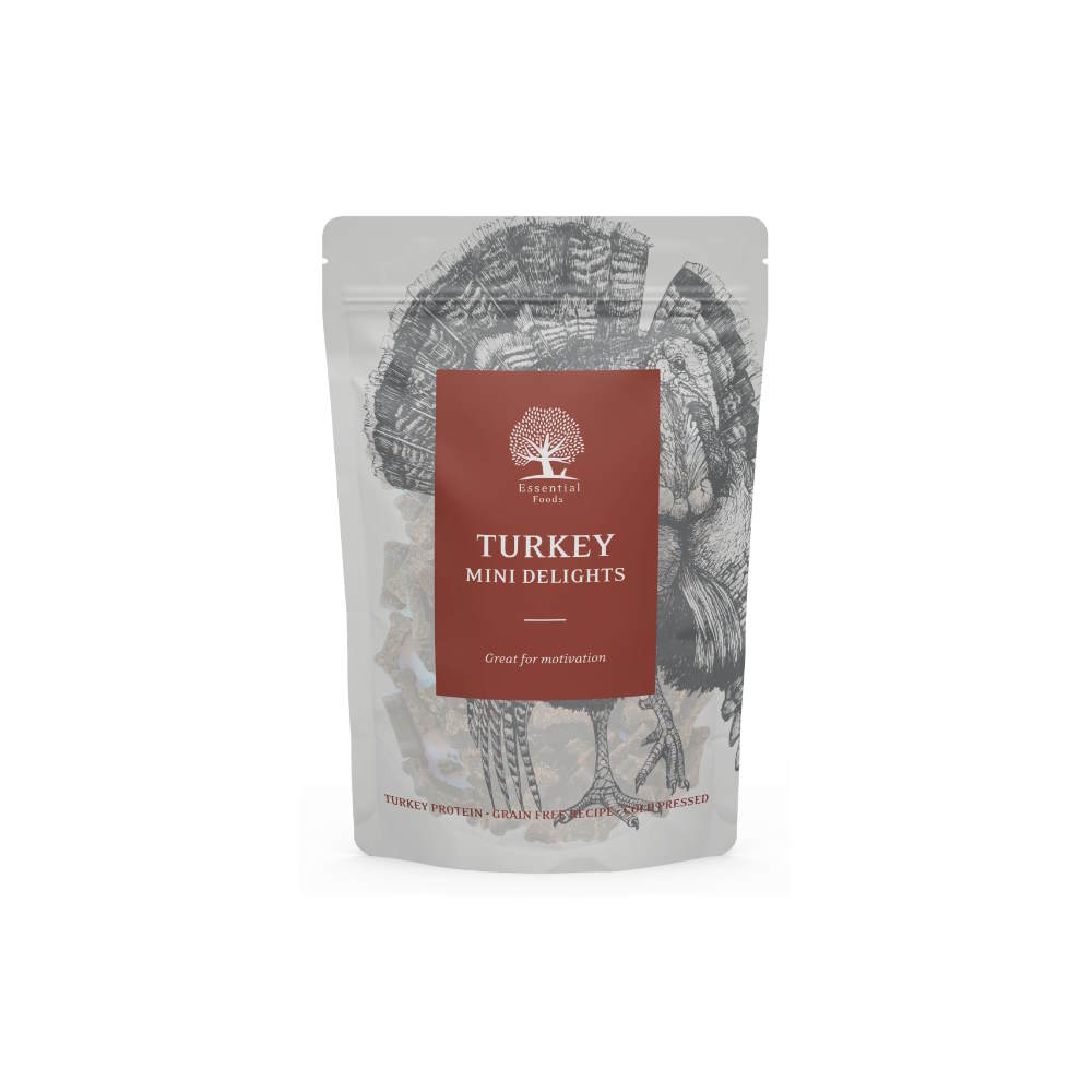 Λαχταριστές Λιχουδιές Μέσης Υγρασίας (Semi – Moist), Χωρίς Σιτηρά, από Γαλοπούλα, κατάλληλες για Όλα τα Σκυλάκια. Ένα συμπλήρωμα διατροφής που μπορεί να δοθεί ανά πάσα στιγμή μέσα στη μέρα ως λιχουδιά, ως κίνητρο κατά την εκπαίδευση, ως επιβράβευση, αλλά και σαν ένα απλό σνακ στη διάρκεια της βόλτας. Πλούσιο σε γαλοπούλα και μαγειρεμένο σε χαμηλές θερμοκρασίες ώστε να διατηρεί την θρεπτική του αξία αναλλοίωτη, το συμπλήρωμα αυτό όπως και οι τροφές της Essential Foods υπακούει στον κανόνα BOF (Behavioural Optimizing Food), διατηρώντας τα επίπεδα ζαχάρου στο αίμα σταθερά στη διάρκεια της ημέρας, αποτρέποντας τις μεγάλες διακυμάνσεις που έχουν επίδραση τόσο στη φυσική κατάσταση, όσο και στη διάθεση του ζώου. Με μικρό μέγεθος – περίπου 1 cm η λιχουδιά – και συσκευασία επανακλειόμενη, οι Essential Turkey Mini Delights θα γίνουν αναπόσπαστο κομμάτι της βόλτας ή του παιχνιδιού, χαρίζοντας στο σκυλάκι σας μπουκιές απόλαυσης !!!