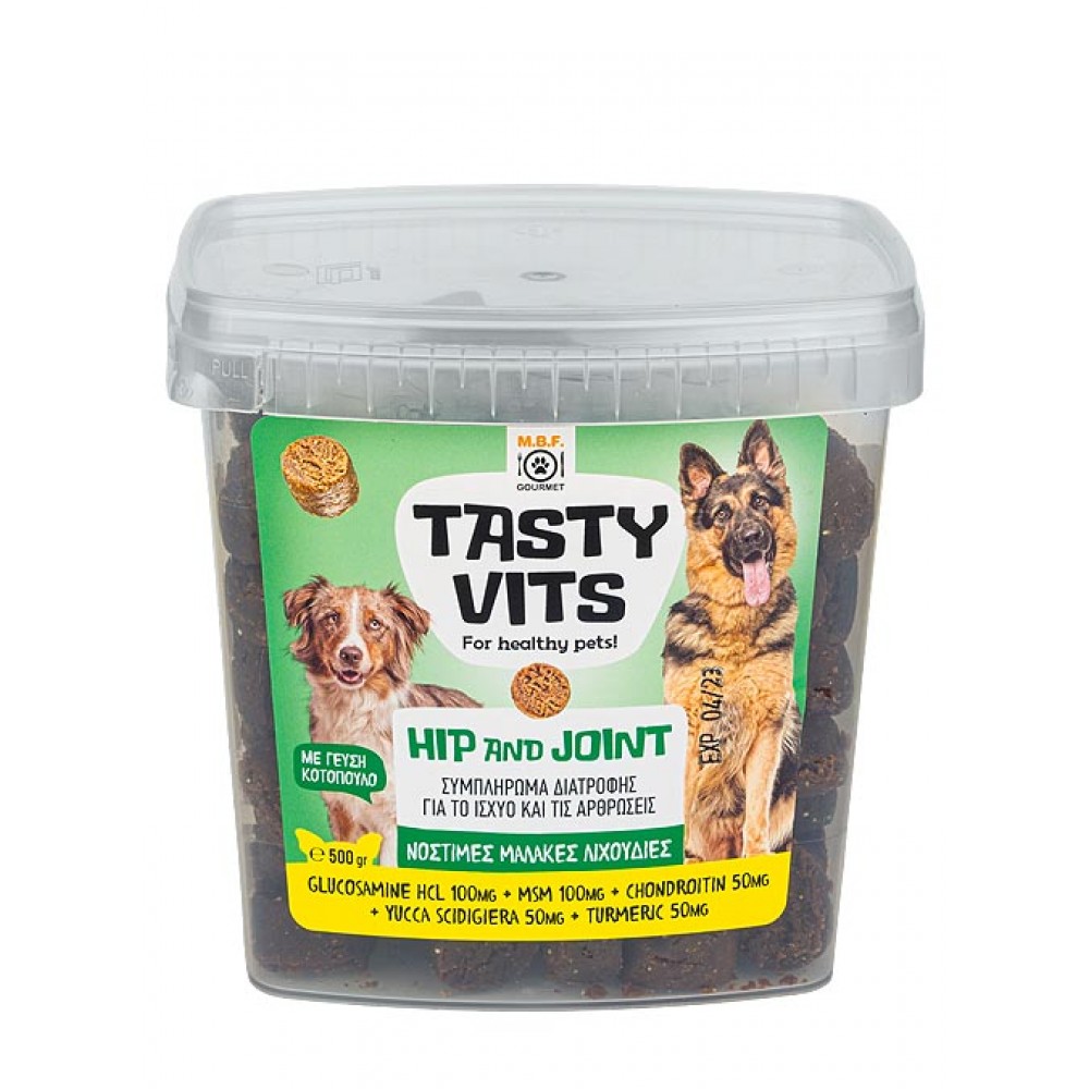 Οι M.B.F. Gourmet Tasty Vits Hip & Joint 500 gr είναι ένα πρακτικό και ευχάριστο συμπλήρωμα διατροφής σε μορφή μαλακών λιχουδιών, σχεδιασμένο για να συμβάλλει στην υποστήριξη της υγιούς λειτουργίας των αρθρώσεων και των ισχίων στο σκύλο σας.