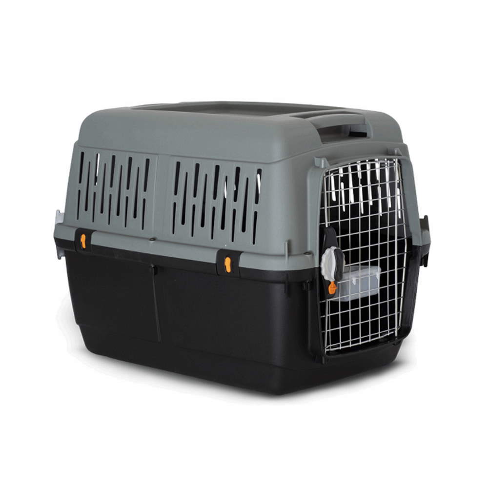 Box μεταφοράς από την MP Bergamo, κατασκευασμένο από 100% ανακυκλωμένο υλικό, κατάλληλο για αρκετά μεγαλόσωμα σκυλάκια. Πρόκειται για στιβαρή κατασκευή, από υψηλής ποιότητας ανθεκτικό πλαστικό, με ομαλή επιφάνεια για εύκολο καθαρισμό, κατάλληλο για μακροχρόνια χρήση και σύμφωνα με τις προδιαγραφές της Διεθνούς Ένωσης Αεροπορικών Μεταφορών IATA (International Air Transport Association). Το πορτάκι είναι μεταλλικό, με μεγάλο άνοιγμα για άνετη πρόσβαση και με κλειδαριά ασφαλείας. Η εύχρηστη λαβή διευκολύνει τη μεταφορά, εφόσον χρησιμοποιηθούν οι έξτρα τροχοί, ενώ το κλουβί ασφαλίζεται περιμετρικά από κλιπ και βίδες ασφαλείας, που σας επιτρέπουν να ανοίγεται και να κλείνετε με ευκολία το καπάκι. Στο προϊόν συμπεριλαμβάνεται μπολάκι νερού, το οποίο στερεώνεται από τη μέσα μεριά της πόρτας.