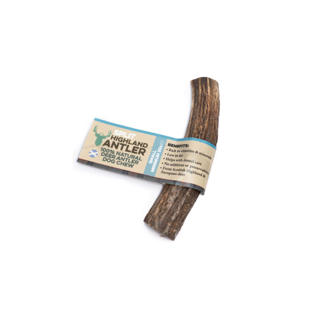 Split, μασώμενα κέρατα ελαφιού, ανοιγμένα με εκτεθειμένο το μεδούλι για μεγαλύτερη ευκολία στη μάσηση, που συλλέγονται με φυσικό τρόπο από κοπάδια ορεινών περιοχών της Σκωτίας, τώρα διαθέσιμα και ως λιχουδιά μακράς διαρκείας, κατάλληλη για σκυλάκια μικρόσωμων φυλών. Πρόκειται για ένα φυσικό προϊόν, cruelty free, αφού τα κέρατα μαζεύονται από το έδαφος, ενώ πρώτα έχουν αποβληθεί με φυσικό τρόπο από το άγριο ελάφι, διαδικασία που λαμβάνει χώρα σε συγκεκριμένη εποχή, μια φορά το χρόνο. Τα Nova Dog Highland Antler Chews περισυλλέγονται και επεξεργάζονται φυσικά - χωρίς χημικά, καθαρίζονται και κόβονται σε διάφορα μεγέθη και βάρη και ταυτόχρονα λειαίνονται όλα τα αιχμηρά τους σημεία, ώστε να είναι ασφαλή προς κατανάλωση από τους μικρούς μας φίλους. Είναι άοσμα, χωρίς πρόσθετα, χωρίς συντηρητικά και δεν λερώνουν !!!
