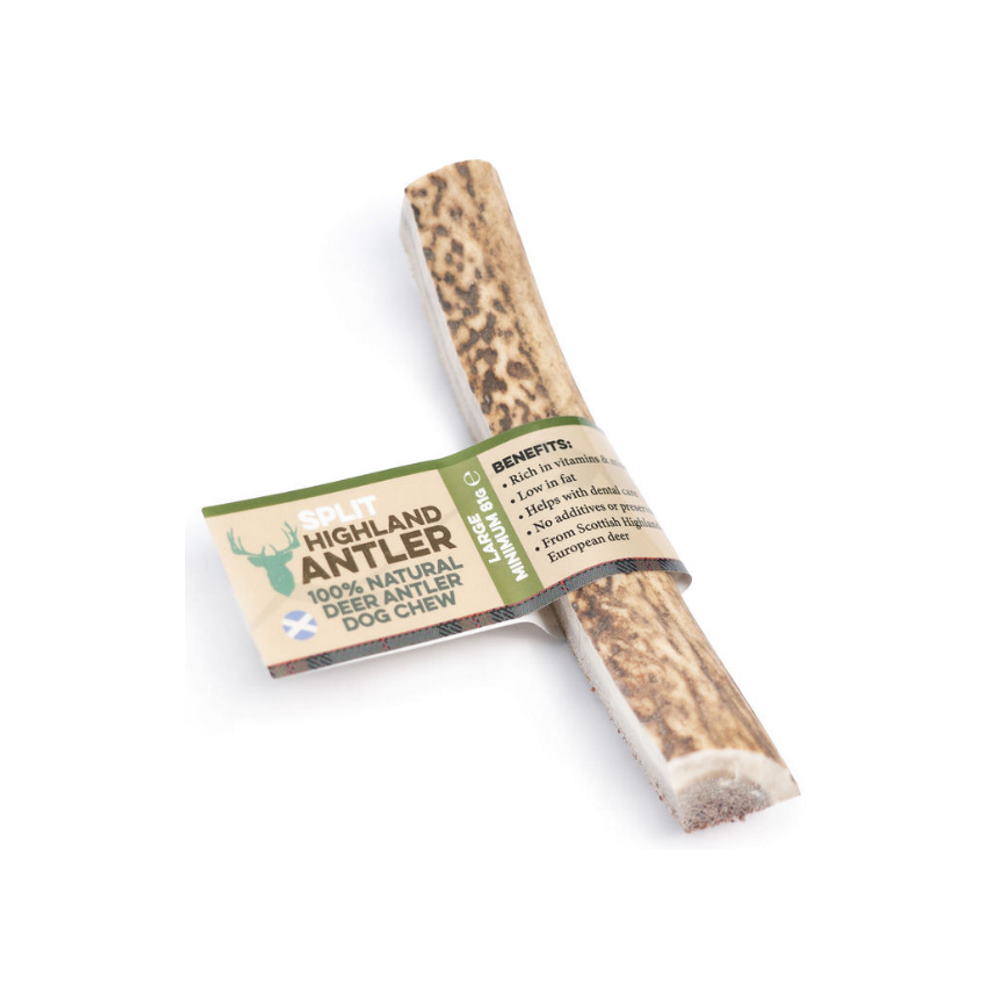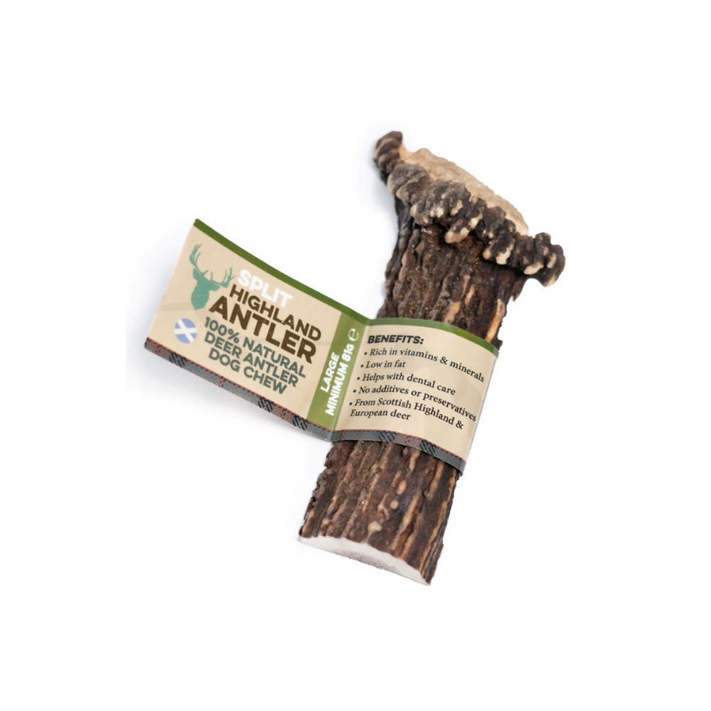 Split, μασώμενα κέρατα ελαφιού, ανοιγμένα με εκτεθειμένο το μεδούλι για μεγαλύτερη ευκολία στη μάσηση, που συλλέγονται με φυσικό τρόπο από κοπάδια ορεινών περιοχών της Σκωτίας, τώρα διαθέσιμα και ως λιχουδιά μακράς διαρκείας, κατάλληλη για σκυλάκια μεγαλόσωμων φυλών. Πρόκειται για ένα φυσικό προϊόν, cruelty free, αφού τα κέρατα μαζεύονται από το έδαφος, ενώ πρώτα έχουν αποβληθεί με φυσικό τρόπο από το άγριο ελάφι, διαδικασία που λαμβάνει χώρα σε συγκεκριμένη εποχή, μια φορά το χρόνο. Τα Nova Dog Highland Antler Chews περισυλλέγονται και επεξεργάζονται φυσικά - χωρίς χημικά, καθαρίζονται και κόβονται σε διάφορα μεγέθη και βάρη και ταυτόχρονα λειαίνονται όλα τα αιχμηρά τους σημεία, ώστε να είναι ασφαλή προς κατανάλωση από τους μικρούς μας φίλους. Είναι άοσμα, χωρίς πρόσθετα, χωρίς συντηρητικά και δεν λερώνουν !!!