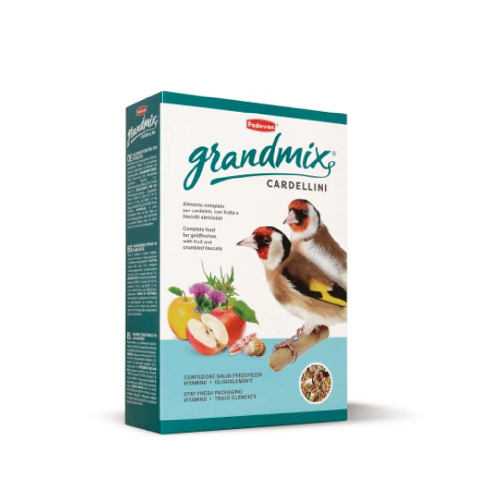 Το μείγμα σπόρων για καρδερίνες από τη σειρά Grandmix της Padovan αποτελείται από μια ποικιλία σπόρων σε συνδυασμό με αφυδατωμένα φρούτα, θρυμματισμένα μπισκότα, σκόνη από όστρακα και συμπλήρωμα βιταμινών, και αποτελεί μια πλήρη τροφή, ιδανική για την κάλυψη των διατροφικών αναγκών του συγκεκριμένου είδους.