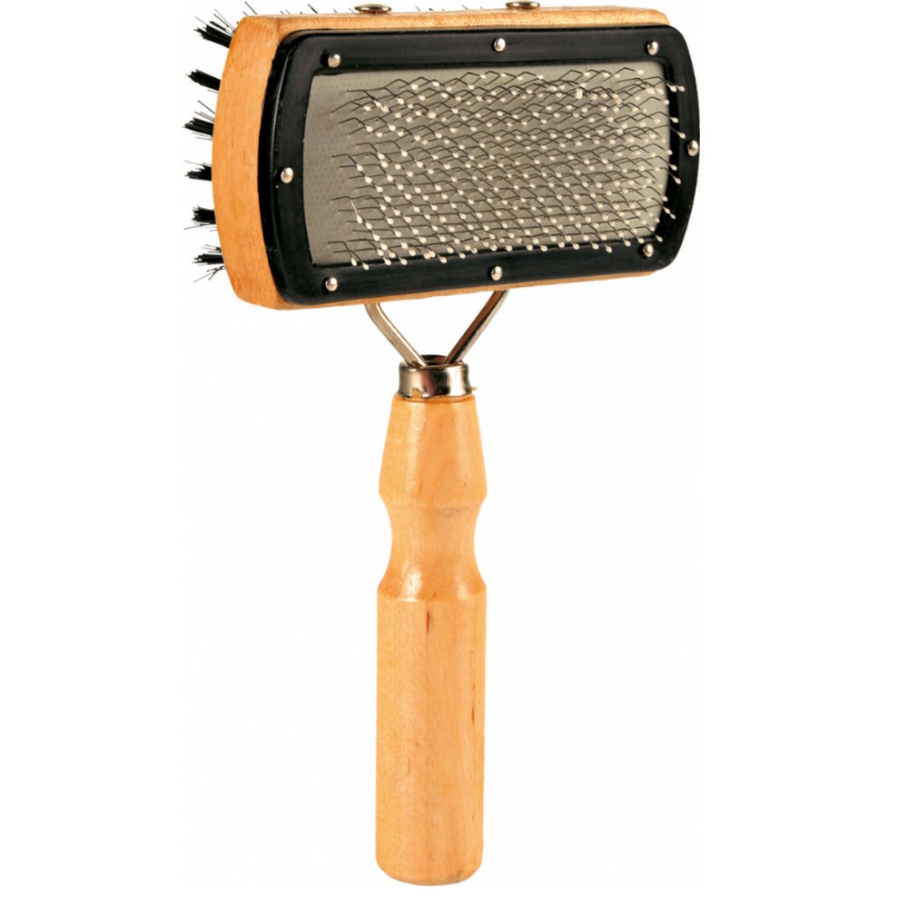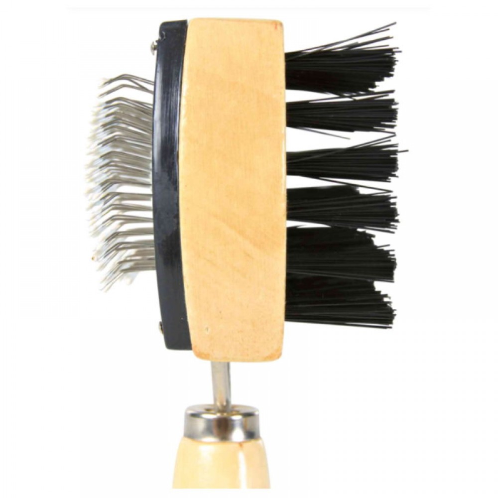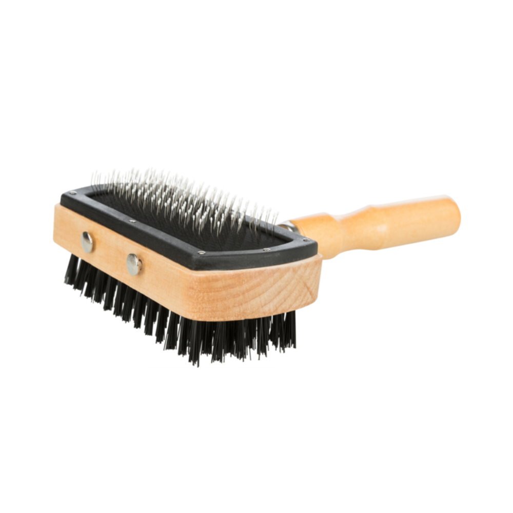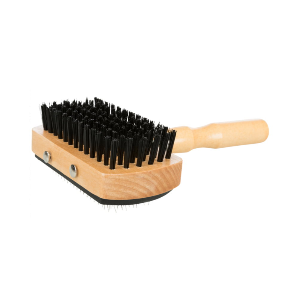 - Ξύλινη βούρτσα 2 όψεων με συνθετική τρίχα για μασάζ και λείανση του άνω/επιφανειακού τριχώματος και συρμάτινες τρίχες για φροντίδα του τριχώματος επιφάνειας και βάσης μαζί.
