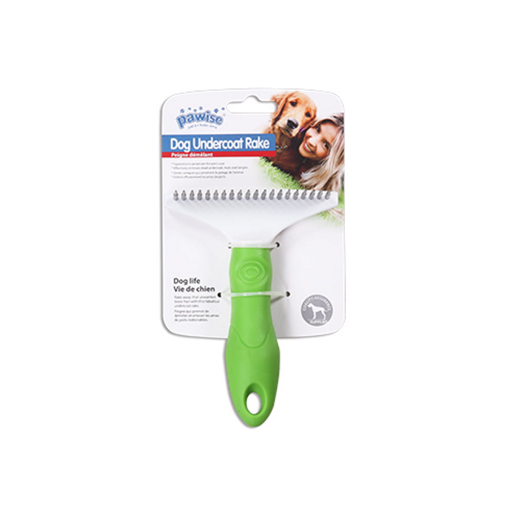Χτένα ξεμπλέγματος με στρογγυλεμένα δόντια, για ήπιο ξεκόμπιασμα, καθώς και για την αφαίρεση του νεκρού τριχώματος σε επιφάνεια και βάση, κατάλληλη αποκλειστικά για σκυλάκια ανεξαρτήτου μεγέθους και ηλικίας. Με την Dog Undercoat Rake της Pawise μπορείτε να ξεμπλέξετε το τρίχωμα σε βάση και επιφάνεια και να απομακρύνετε νεκρές τρίχες ανώδυνα και χωρίς τραυματισμούς, με γρήγορο και εύκολο τρόπο, ειδικά κατά τις περιόδους όπου το ζωάκι σας αλλάζει τρίχωμα. Τα δοντάκια της χτένας είναι μεταλλικά, ενώ το κυρίως σώμα είναι από καουτσούκ για σταθερό κράτημα, άνετο στη χρήση.