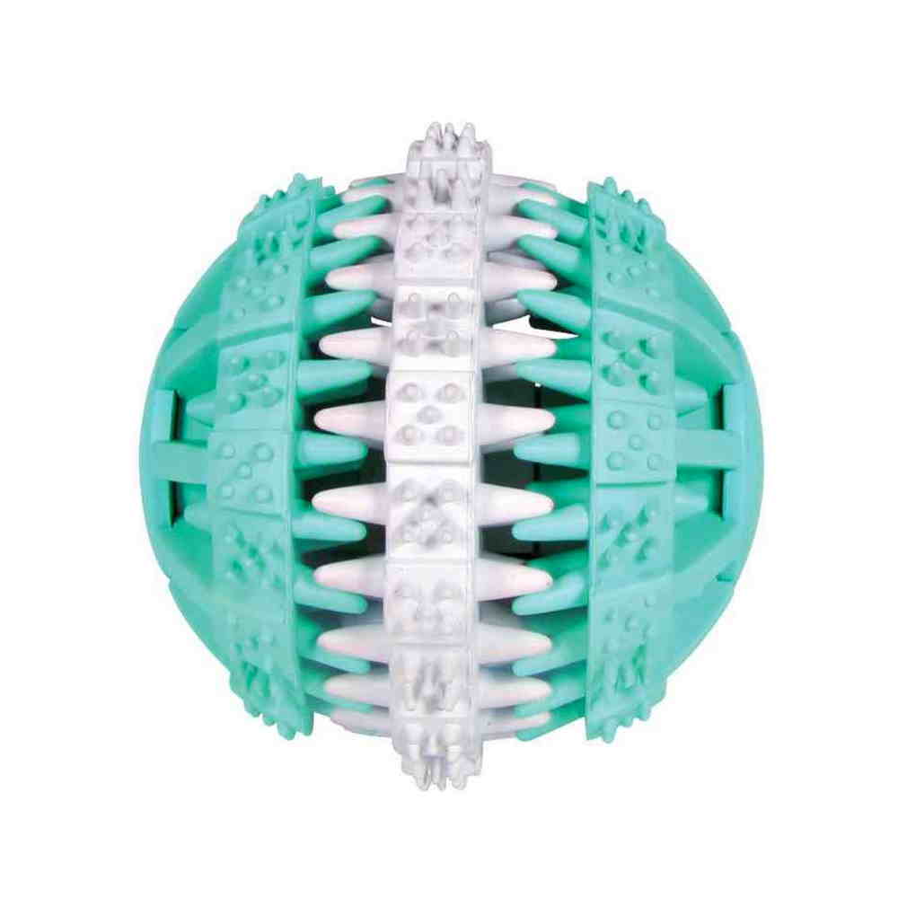 Μπάλα απο σκληρό φυσικό λάστιχο με ειδικά σχεδιασμένες τρύπες και ανάγλυφα σχέδια. Χάρη στον ιδιαίτερο σχεδιασμό του βοηθάει τον καθαρισμό των δοντιών και κάνει μασάζ στα ούλα κατα την διάρκεια του παιχνιδιού. Με ευχάριστη γεύση μέντας για δροσερή αναπνοή. Μπορεί να συνδυαστεί με οδοντόκρεμα στις εσωχές για σκυλάκια που δεν δέχονται το βούρτσισμα. Μπορείτε να σφινώσετε και λιχουδιές ή την ξηρά τροφή ανάμεσα στα λαστιχένια δοντάκια για να αυξήσετε το ενδιαφέρον του σκύλου σας και να τον παροτρίνετε να παίξει περισσότερο. Διαστάσεις: 7 cm. Χρώμα: μέντα.