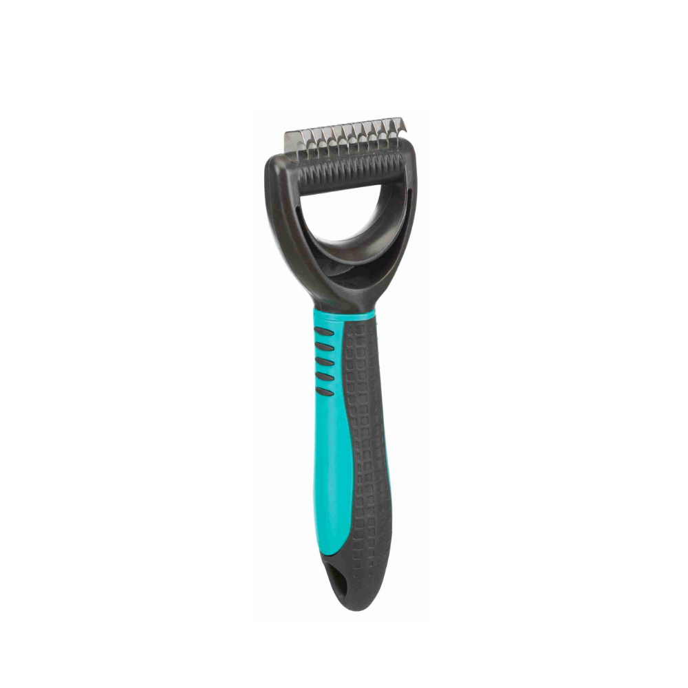 Universal Groomer ειδική χτένα με αραιά δόντια για την αφαίρεση και αραίωση του τριχώματος βάσης στις περιόδους αλλαγής του τριχώματος. Επειδή σε εκείνες τις φάσες η τριχόπτωση των διπλότριχων ζώων είναι αρκετά μεγάλη, αρκετό από το τρίχωμα βάσης πρέπει να αφαιρεθεί για να διέρχεται καλύτερα ο αέρας μέσα από το τρίχωμα και να δροσίζεται το ζώο με φυσικό τρόπο. Επίσης λειαίνει και το άνω τρίχωμα κόβοντας παράλληλα απαλά μικρές τουφίτσες. Η χτένα αυτή παρέχει έναν γρήγορο και εύκολο τρόπο για να απαλλαγείτε από τις υπερβολικές τρίχες. Η λαβή αποτελείται από πλαστικό και καουτσουκ υλικό που δεν γλιστράει στο χέρι για να κάνει πιο ασφαλή και άνετη την εφαρμογή στο χέρι σας κατά την εφαρμογή. Μπορεί να χρησιμοποιηθεί σε σκύλους και γάτες.
