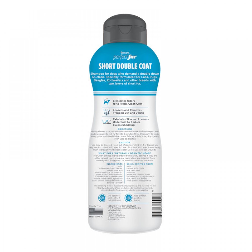 Σαμπουάν ειδικά σχεδιασμένο για σκύλους με κοντό, διπλό μανδύα. Παράγεται από φυσικά συστατικά. Εμπλουτισμένο με φυσικά συστατικά για να επαναφέρει τη φυσική υγρασία του δέρματος. Καθαρίζει σε βάθος τα κατοικίδια κάνοντας πλούσιο αφρό.Το ελαφρύ τροπικό άρωμα αφήνει αίσθηση φρεσκάδας και αναζωογόνησης στο ζωάκι σας. Ιδανικό για φυλές με κοντό τρίχωμα όπως: labs, pugs, beagles, rottweilers.