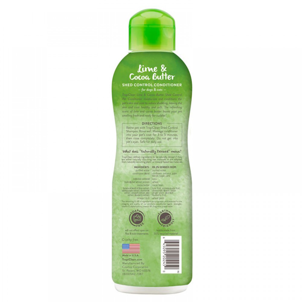 Μαλακτικό με λάιμ, βούτυρο, κακάο, Ωμέγα -3  & -6 λιπαρά οξέα. Βοηθάει στην καταπολέμηση της τριχόπτωσης, φροντίζει το δέρμα και ξεμπερδεύει το τρίχωμα. Το ρόδι που περιέχει αναπληρώνει τη φυσική υγρασία και διατηρεί απαλό δέρμα και τρίχωμα. Το αναζωογονητικό άρωμα του λάιμ και του βουτύρου κακάο αφήνει το κατοικίδιό σας να μυρίζει φρεσκάδα και είναι έτοιμα για αγκαλιές.