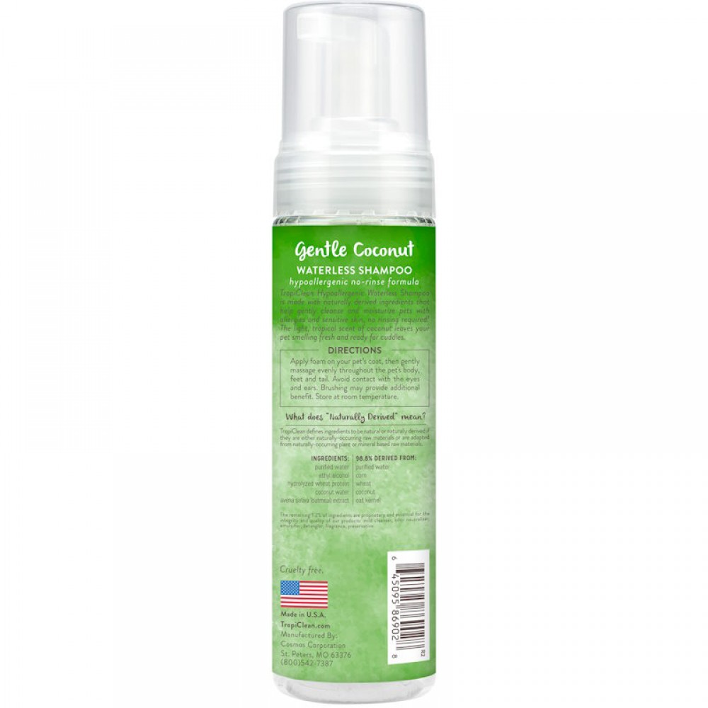 Υποαλλεργικό σαμπουάν στεγνού καθαρισμού που κρατά το κατοικίδιο καθαρό μέχρι το επόμενο μπάνιο. Μείγμα καρύδας και αλόης που καθαρίζει και αρωματίζει ακόμα και το πιο ευαίσθητο δέρμα, ενώ είναι κατάλληλο για χρήση σε κουτάβια και γατάκιαΕξαλείφει αποτελεσματικά τις οσμές των κατοικίδιων χωρίς να χρειάζεται ξέβγαλμα. Φτιαγμένο με ένα απαλό μείγμα εκχυλισμάτων από αγγούρι και πλιγούρι βρώμης.