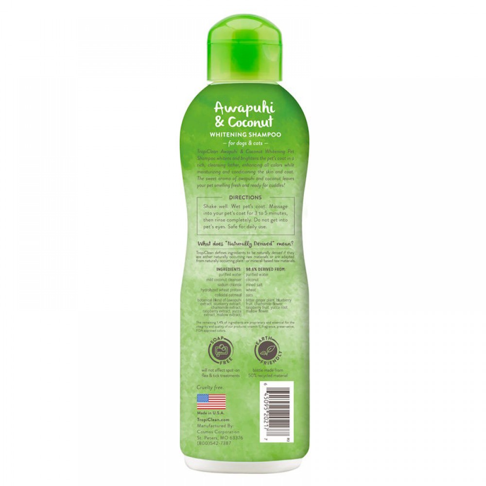 Σαμπουάν με awapuhi και καρύδα, ενισχύει και τονίζει το λευκό τρίχωμα. Η βρώμη και η καρύδα απαλύνουν το δέρμα, γυαλίζουν το τρίχωμα και χαρίζουν υπέροχο άρωμα. Εμπλουτισμένο με φυσικά συστατικά για να επαναφέρει τη φυσική υγρασία του δέρματος. Καθαρίζει σε βάθος τα κατοικίδια κάνοντας πλούσιο αφρό. Το ελαφρύ τροπικό άρωμα της καρύδας αφήνει αίσθηση φρεσκάδας και αναζωογόνησης στο ζωάκι σας.