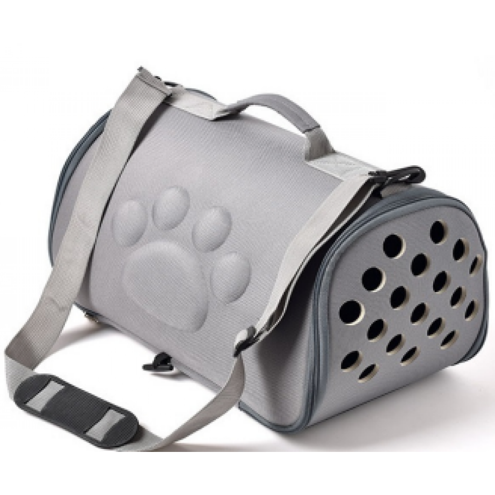 Μοντέρνα τσάντα μεταφοράς για μικρόσωμα σκυλάκια και γάτες, χρώματος γκρι και διαστάσεων 52x27x32 εκατοστά. Παρέχει εύκολη εφαρμογή στον ώμο σας για να μεταφέρετε άνετα και με ασφάλεια τον μικρό σας φίλο, καθώς σας αισθάνεται δίπλα του. Εξαιρετικά ανθεκτική, με ειδικούς αεραγωγούς, ώστε να απολαμβάνει την βόλτα του παρατηρώντας. Αποτελεί ιδανικό αξεσουάρ για εσάς όταν θέλετε να έχετε τα χέρια σας ελεύθερα, ενώ το σχήμα της τσάντας εμποδίζει την οποιαδήποτε "απόδρασή" και κρατάει ασφαλές το ζωάκι σας.