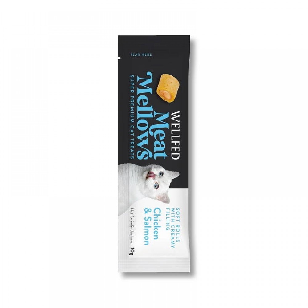 Γευστικές λιχουδιές σε μπουκίτσες με κρούστα εξωτερικά και κρεμώδη γέμιση κοτόπουλο - σολομό. Κατάλληλες για ανήλικες, ενήλικες και ηλικιωμένες γατούλες. Χαρίζουν στη γατούλα διπλή απόλαυση εξαιτίας των 2 διαφορετικών υφών που έχουν. Είναι καρυκευμένες με φυσικές γεύσεις μιας και αποτελούνται από φυσικά συστατικά και δεν περιέχουν σιτηρά, συντηρητικά ή τεχνητά χρώματα. Έχουν υψηλή περιεκτικότητα σε υγρασία μιας και τη χρειάζονται οι γατούλες και χαμηλή περιεκτικότητα σε λιπαρά. Μπορείτε να την προσφέρετε ως λιχουδιά, ως συμπλήρωμα στην καθημερινή της διατροφή ή ακομα μπορείτε να την προσθέσετε στην ξηρά τροφή της για επιπλέον υγρασία και γεύση. Αποτελεί υψηλής ποιότητας λιχουδιά με 92.5% ζωική πρωτείνη, ταυρίνη & 70% υγρασία. (Η ταυρίνη είναι ένα απαραίτητο αμινοξύ που παίζει καθοριστικό ρόλο στη διατήρηση της υγείας και της ευημερίας των γατών. Οι γάτες δεν μπορούν να συνθέσουν επαρκείς ποσότητες ταυρίνης στο σώμα τους, επομένως πρέπει να λαμβάνεται μέσω της διατροφής τους.)