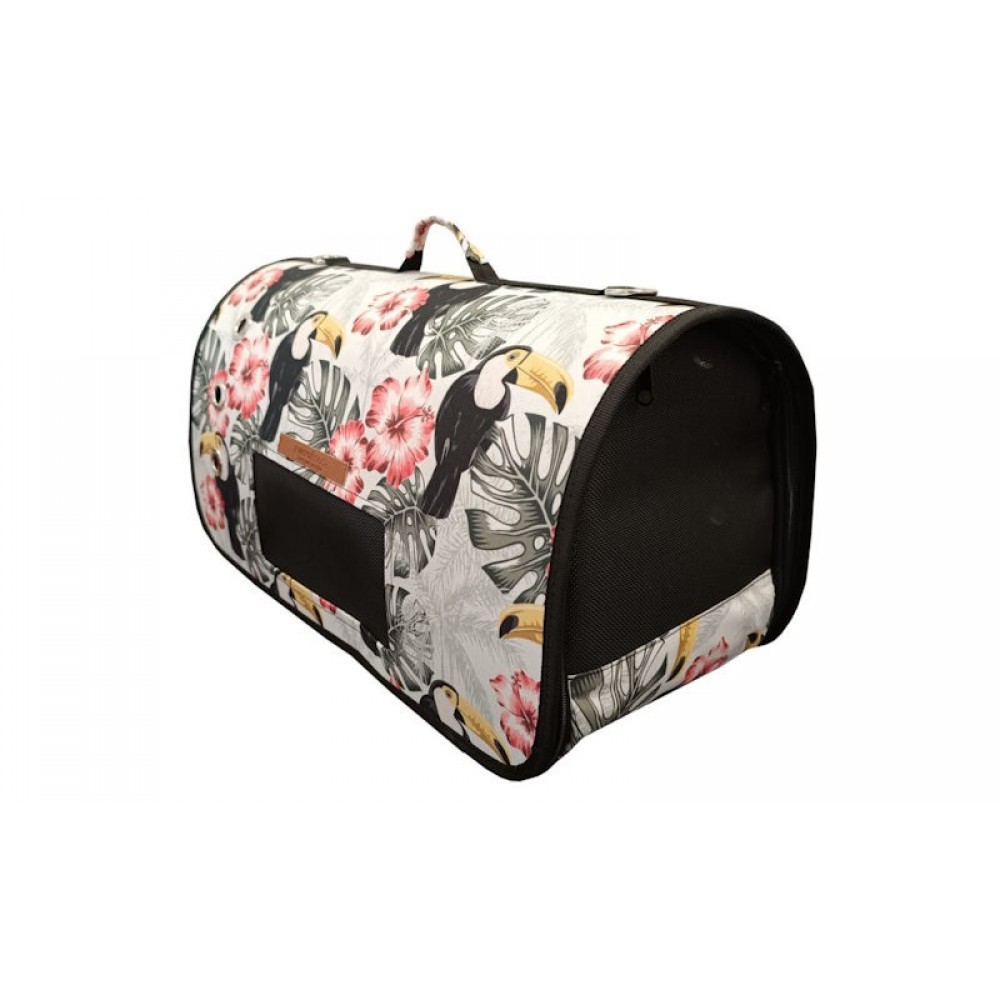 Μοντέρνα τσάντα μεταφοράς ώμου – χειρός ιδανική για πολύωρα ταξίδια ή μεταφορά σε αεροπλάνο*, κατάλληλη για μικρόσωμα σκυλάκια, γάτες και τρωκτικά, σε σχέδιο "λουλούδια - παπαγάλος" από αδιάβροχο ανθεκτικό ύφασμα. Ο ιμάντας ώμου παρέχει εύκολη εφαρμογή στον ώμο σας για να μεταφέρετε άνετα και με ασφάλεια τον μικρό σας φίλο, καθώς σας αισθάνεται δίπλα του. Εξαιρετικά ανθεκτική, με ειδικούς αεραγωγούς και στις τέσσερις πλευρές (όπως ορίζουν πλέον οι αεροπορικές εταιρείες για τη μεταφορά ζώων εντός καμπίνας του αεροσκάφους*) και έξτρα τρύπες (μπουντούζια), για άριστο εξαερισμό και μικρό παραθυράκι, ώστε να απολαμβάνει την βόλτα του παρατηρώντας. Αποτελεί ιδανικό αξεσουάρ για εσάς όταν θέλετε να έχετε τα χέρια σας ελεύθερα, ενώ το σχήμα της τσάντας εμποδίζει την οποιαδήποτε "απόδρασή" και κρατάει ασφαλές το ζωάκι σας.