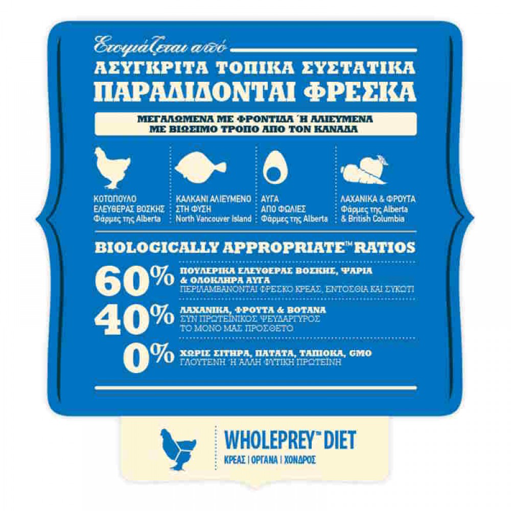 Συστατικά: Φρέσκο Κοτόπουλο (14%), Αφυδατωμένο Κοτόπουλο (14%), Ολόκληρες Κόκκινες Φακές, Ολόκληρος Πράσινος Αρακάς, Ολόκληρα Ρεβίθια, Φρέσκα Εντόσθια Κοτόπουλου (Συκώτι, Καρδιά) (5,5%), Αφυδατωμένη Ρέγγα (5%), Λίπος Κοτόπουλου (5%), Αφυδατωμένη Γαλοπούλα (5%), Αυγά (4%), Ωμό Καλκάνι (4%), Ιχθυέλαιο (3%), Ολόκληρες Πράσινες Φακές, Ολόκληρος Κίτρινος Αρακάς, Ίνες Αρακά, Άμυλο Αρακά, Ωμό Συκώτι Γαλοπούλας (0,5%), Αλάτι, Αποξηραμένα Φύκια, Φρέσκα Ολόκληρα Μήλα, Φρέσκια Ολόκληρη Κίτρινη Κολοκύθα, Φρέσκα Ολόκληρα Καρότα, Φρέσκα Ολόκληρα Αχλάδια, Φρέσκια Ολόκληρη Κολοκύθα, Φρέσκο Ολόκληρο Κολοκύθι, Φρέσκα Φύλλα Παντζαριού, Φρέσκο Kale, Φρέσκο Σπανάκι, Φρέσκα Φύλλα Γογγυλιού, Φρέσκα Ολόκληρα Μύρτιλα, Φρέσκα Ολόκληρα Κράνμπερι, Φρέσκα Ολόκληρα Μούρα Saskatoon, Ρίζα Λάππας, Λεβάντα, Ρίζα Μολόχας, Γαϊδουράγκαθο, Καρποί Τριανταφυλλιάς, Κουρκουμάς.