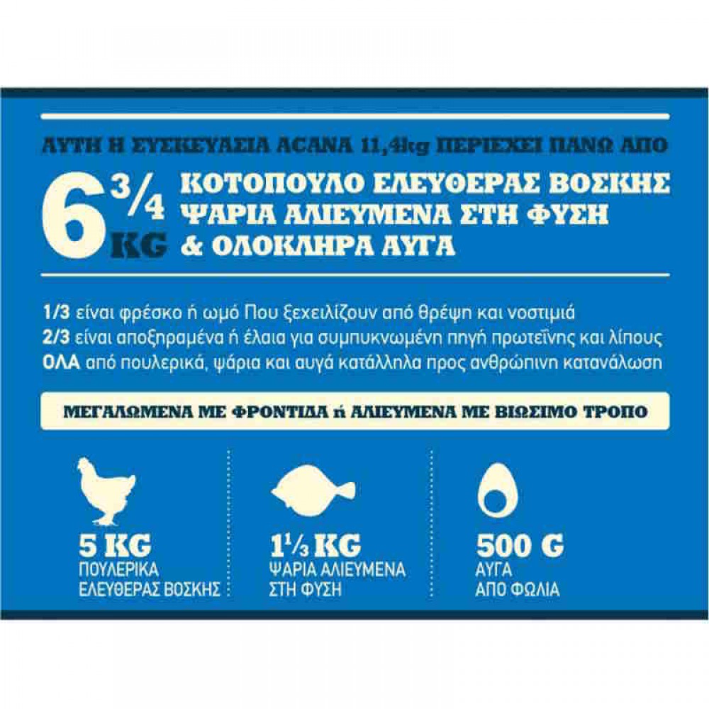 Οι τροφές της Acana ξεχωρίζουν για την υψηλή περιεκτικότητά τους σε θρεπτική ζωική πρωτεΐνη, τη μεγάλη γευστικότητα και την ευρεία ποικιλία τους. Απαλλαγμένες από χρωστικές ουσίες, τεχνητά συντηρητικά ή ενισχυτικά γεύσης και ελεύθερες από προσθήκες αλλεργιογόνων συστατικών όπως η σόγια, το καλαμπόκι, η ταπιόκα και το σιτάρι, οι συνταγές της Acana είναι βέβαιο ότι μπορούν να ικανοποιήσουν ακόμα και τους πιο απαιτητικούς ουρανίσκους πάντα με γνώμονα την υψηλή ποιότητα και φρεσκάδα των συστατικών τους.