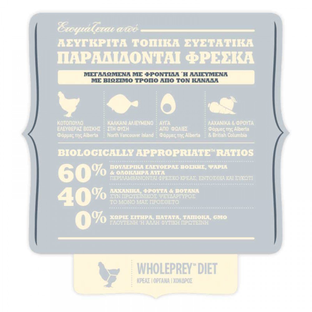 Συστατικά: Φρέσκο Κοτόπουλο (16%), Αφυδατωμένο Κοτόπουλο (15%), Ολόκληρες Κόκκινες Φακές, Ολόκληρος Πράσινος Αρακάς, Ολόκληρα Ρεβίθια, Αφυδατωμένη Γαλοπούλα (4,5%), Λίπος Κοτόπουλου (4%), Φρέσκα Εντόσθια Κοτόπουλου (Συκώτι, Καρδιά) (4%), Αφυδατωμένη Ρέγγα (4%), Αυγά (4%), Ωμό Καλκάνι (4%), Ιχθυέλαιο (4%), Ολόκληρες Πράσινες Φακές, Ολόκληρος Κίτρινος Αρακάς, Ίνες Αρακά, Άμυλο Αρακά, Ωμό Συκώτι Γαλοπούλας (0,5%), Αλάτι, Αποξηραμένα Φύκια, Φρέσκια Ολόκληρη Κολοκύθα, Φρέσκια Ολόκληρη Κίτρινη Κολοκύθα, Φρέσκα Ολόκληρα Καρότα, Φρέσκα Ολόκληρα Μήλα, Φρέσκα Ολόκληρα Αχλάδια, Φρέσκο Ολόκληρο Κολοκύθι, Αποξηραμένη Ρίζα Πικραλίδας, Φρέσκο Kale, Φρέσκο Σπανάκι, Φρέσκα Φύλλα Γογγυλιού, Φρέσκα Φύλλα Παντζαριού, Φρέσκα Ολόκληρα Κράνμπερι, Φρέσκα Ολόκληρα Μύρτιλα, Φρέσκα Ολόκληρα Μούρα Saskatoon, Κουρκουμάς, Γαϊδουράγκαθο, Ρίζα Λάππας, Λεβάντα, Ρίζα Μολόχας, Καρποί Τριανταφυλλιάς.