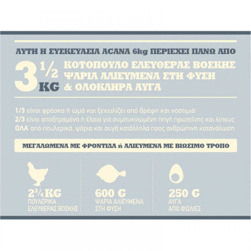 Από φρέσκα συστατικά αρίστης ποιότητας και πρώτες ύλες διαλεγμένες με επιμέλεια από επιλεγμένους και έμπιστους τοπικούς παραγωγούς, ώστε να πληρούν τα υψηλά ποιοτικά στάνταρ, οι συνταγές τις Acana σχεδιάζονται από εξειδικευμένους διατροφολόγους και κτηνιάτρους με σκοπό να καλύπτουν όλες τις διατροφικές ανάγκες των μικρών μας φίλων, προσφέροντάς τους πλούσιο περιεχόμενο σε πρωτεΐνες και υψηλή γευστικότητα, ενώ ταυτόχρονα ενισχύουν τη συνολική υγεία και ευεξία τους.